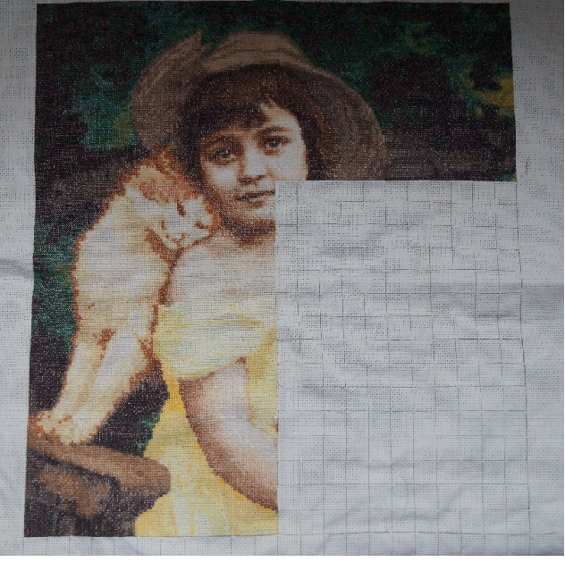 Да , согласна, отчасти еще легко вышивается, тк видишь в процессе, что производитель так умудрился подобрать цвета ниточек, что и личико и ручки девочки выглядят изумительноправда кошечка на фоне девочки получилась немного безликая, но видимо не все сразу))))