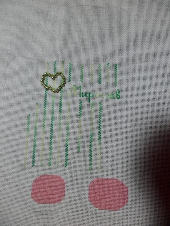 Чего-то я запуталась совсем((( Начала вышивать игрушку для крестника, взяла набор от панна. Решила начать с спинки и с чего-то решила вышить бисером сердечко, да и имя мне приспичило вышить нитками...