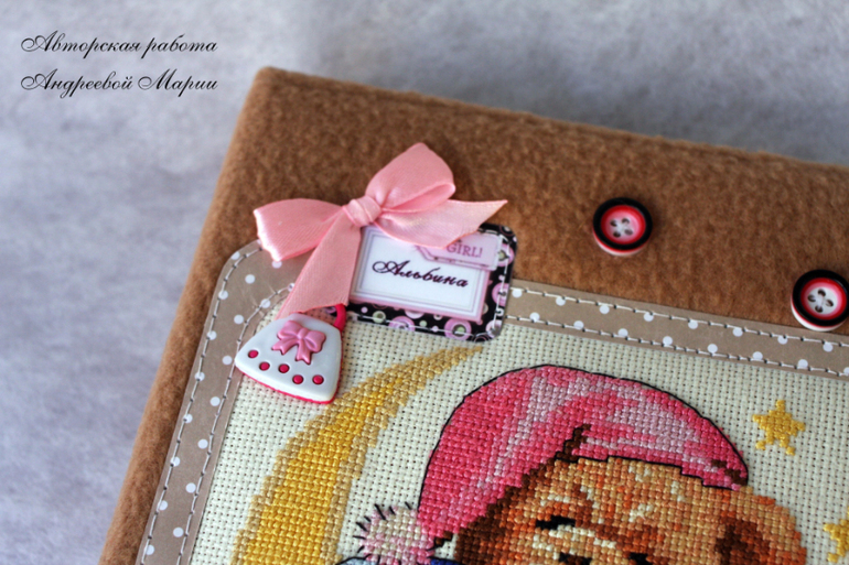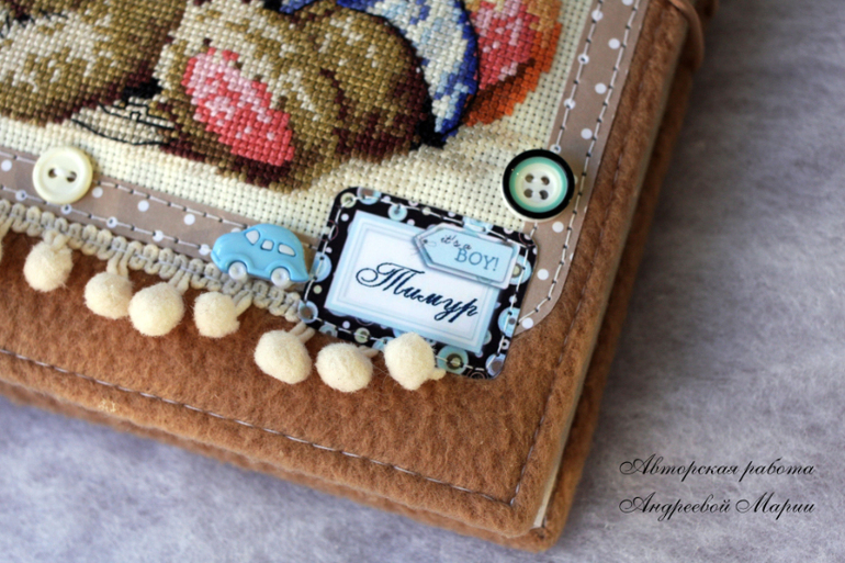 Вышивка крестомВот такой получился на заказ альбомчик для двойни. Обложка - коричневый флис + вышивка крестом. На 100 фото. Размер 19 на 23 см. Закрывается на резиночку и пуговку. Внутри тэги с данными малышей, кармашки под бирочку и данные о рождении. Кому интересно прошу под кат. Критика приветствуется.