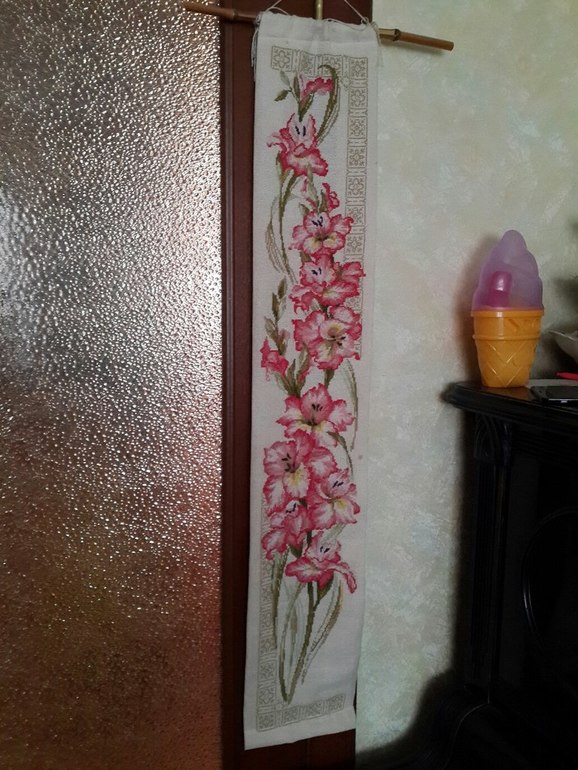 4. Гладиолусы мои любимые цветы. Вродебы и быстро я их вышила но намучалась с шерстяными нитками не нравятся они мне. Ни как их не оформляла просто на палочку одела