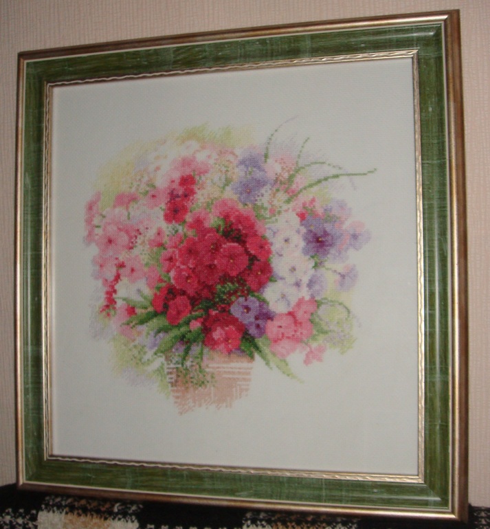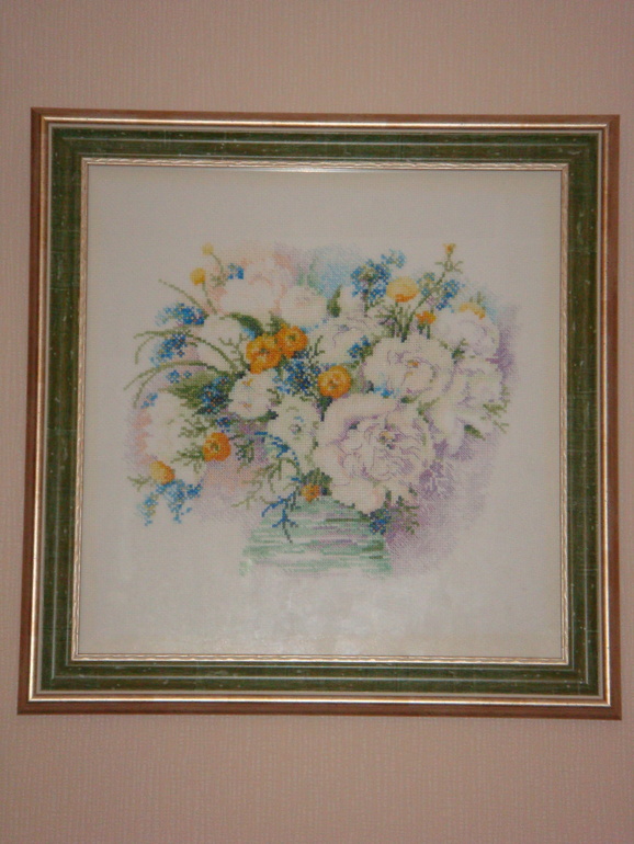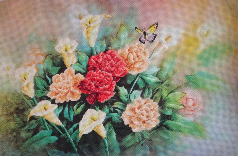 Уже в декрете заканчивала эту вышивку по китайскому набору.Пионы и каллы, подарена