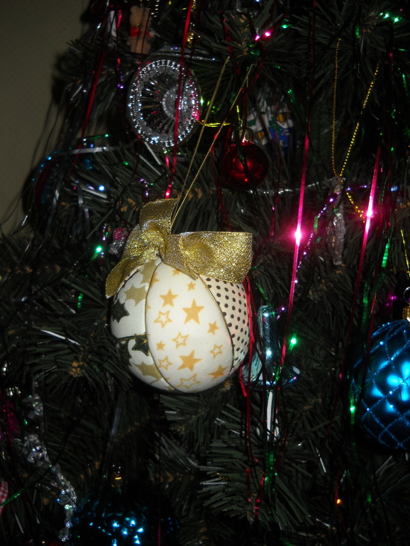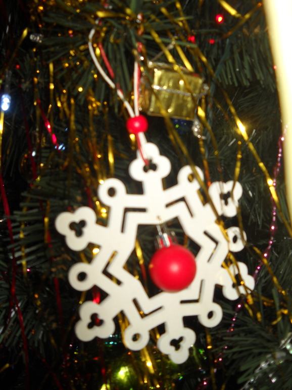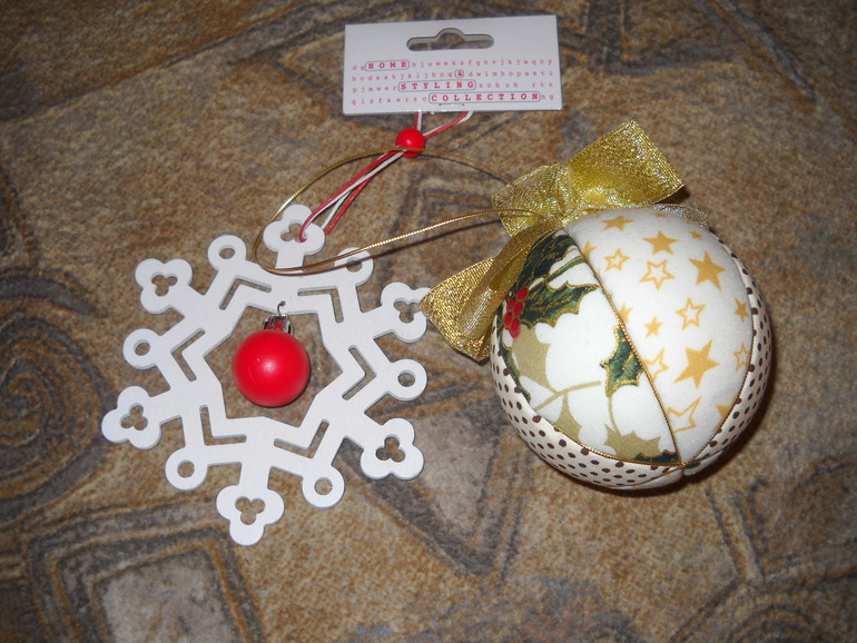 А это подарочки для моей ёлки, которую я в этом году решила не наряжать. И места нет из-за двух крысиных клеток и вообще, что-то лениво. Но, т.к. праздники я встречаю с подружкой, то временно повесила игрухи ей на ёлку. Завтра сниму и повешу на ёлку к деткам))) Деревянная снежинка хороша, я люблю деревянные игрухи. А такой шарик я давно хотела попробовать сделать сама, да все руки не доходили))) Здорово! На следующий год на свою ёлку повешу!