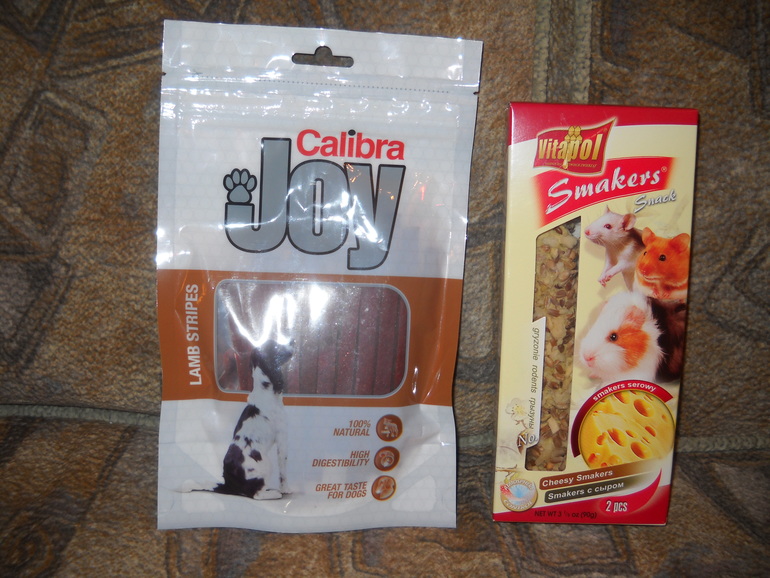 А когда я увидела эти две упаковочки, я чуть слезу не пустила от умиления! Гостинцы моим крыскам и собачкам! Думаю, и кошка Амура (молодуха наша) не откажется закусить лакомством, а про собаку Белку и говорить нечего))) Может и Зоська попробует (если покрошить). А крысики будут довольны! Они любят такие штуковинки))) Т.ч. спасибо тебе от нашего мехового коллектива!