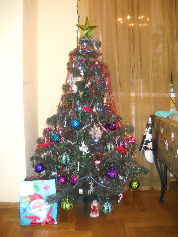 Ну, во первых я забрала свой подарок по дороге в гости к подруге, с которой мы встречали НГ. На этот праздник я подарила ей ёлку и кучу ёлочных украшений. А Викусин подарок самый первый в жизни этой ёлочки))) Заодно и обновили)))