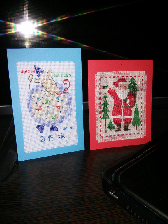 В последние деньги уходящего года вышила Санту и Овечку. В оформлении не хватает ленточек, потому что не было рядом дырокола, чтобы сделать красивые дырочки)))