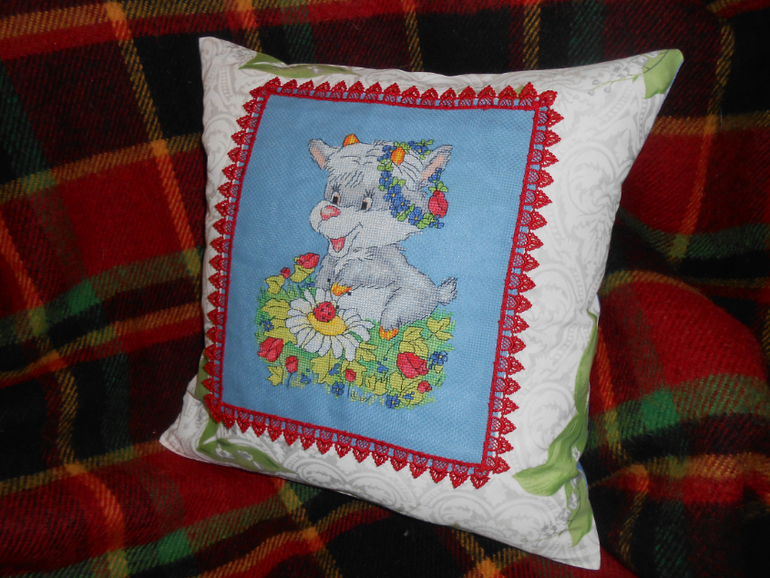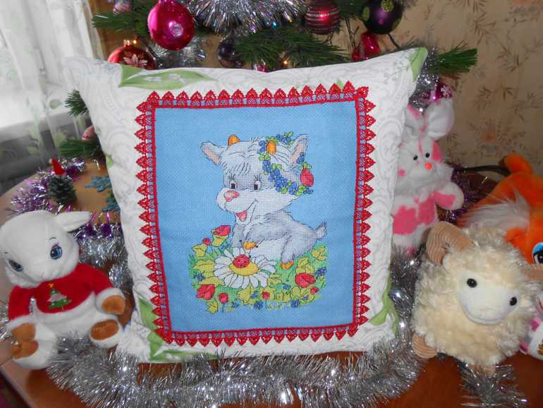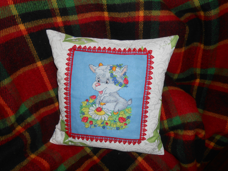 Вышивка крестомРешила я оформить свою рогатую милашку в виде подушки. Это мой первый опыт в шитье на швейной машинке, так что не судите строго, буду совершенствоваться. Вот, что получилось.