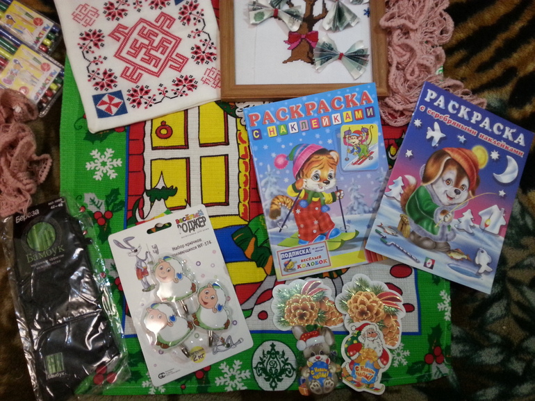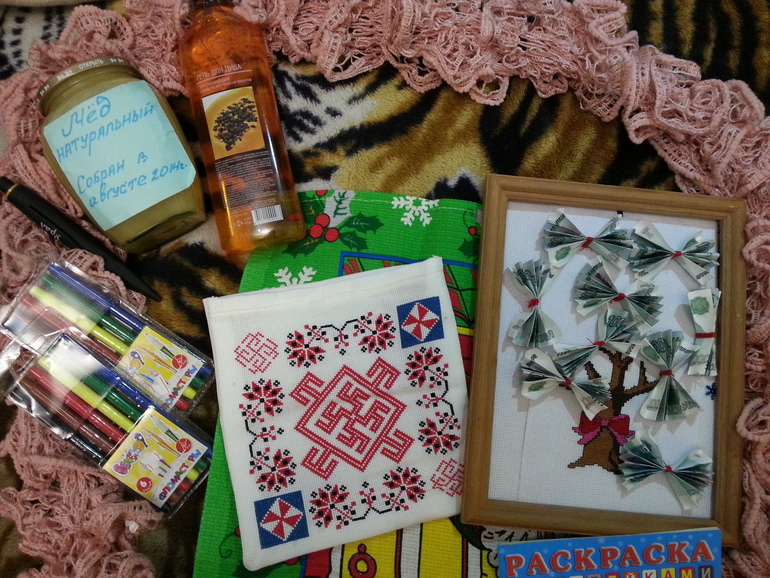 Ручка,красивое полотенце,крючки,раскраски,фломастеры,шарфик,вкусненький медок,гель для душа