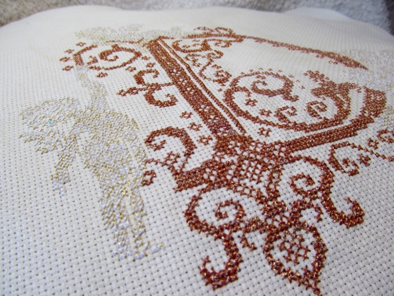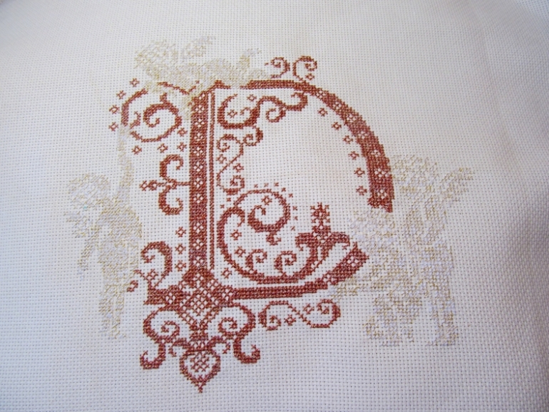 3. Буква на подушку... тоже еще не сшила подушку..подбираю задник))) мне нравится какой эффект получился с ангелами..они вышиты белым цветом с золотой нитью...и такие получились призрачно-воздушные...какими они наверное и должны быть ..ну в моем прочтении конечно...сама буква тоже металлик+мулине.