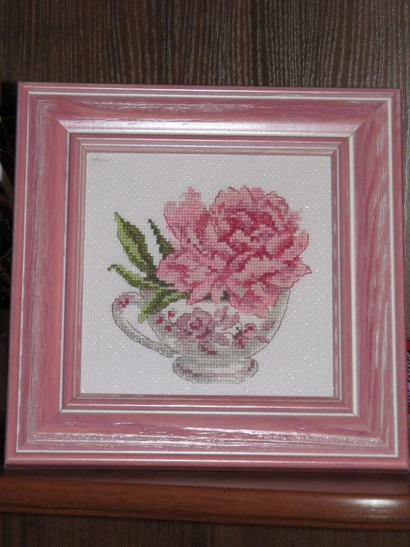 2. Чашка с пионом. Вышивала для бабулечки своей на др 22 января))) Канва с люрексом. Оформляла сама, спешила к др. схема из и-нета, нитки подбором...по моему...даже бленды делала...