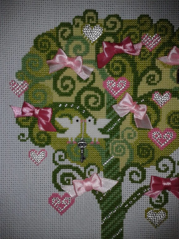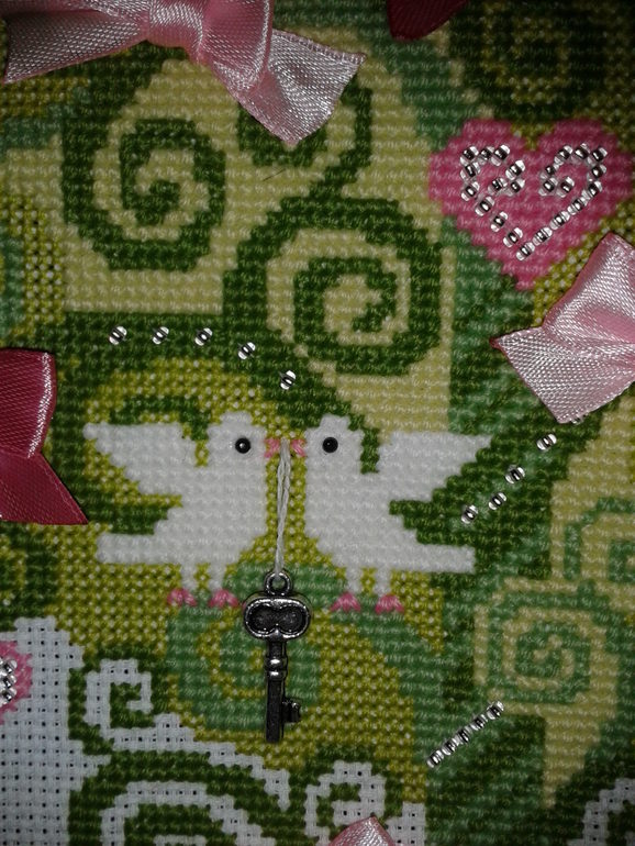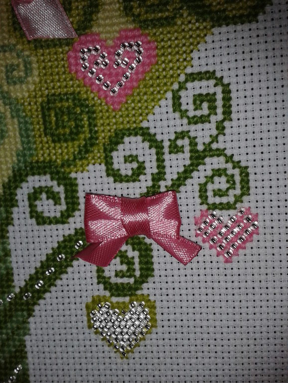 На самом деле, крестики вышиваются на раз, а вот над остальным пришлось потрудиться, xотя на бисер, ленты и подвески у меня ушел только 1 вечер, очень уж хотелось закончить поскорее.