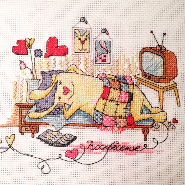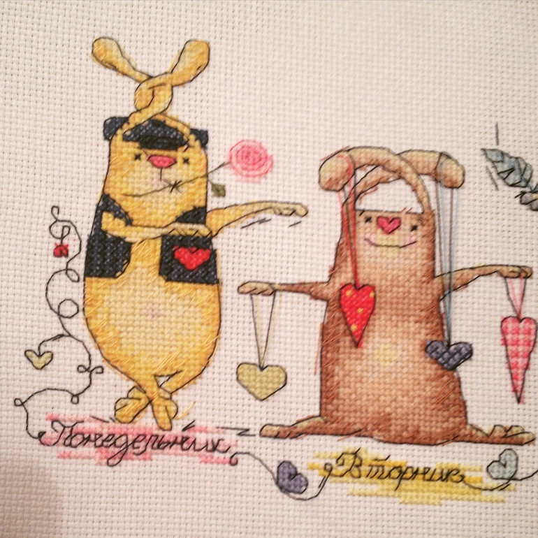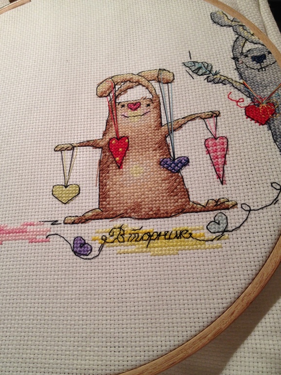 Вышивальные процессыЯ влюбилась в эту вышивку сразу. Вышиваю я с оооочень большими перерывами, но если возьмусь, то зайца за 2-3 дня сделаю. Пока сделано чуть больше половины - 4 зайчика.