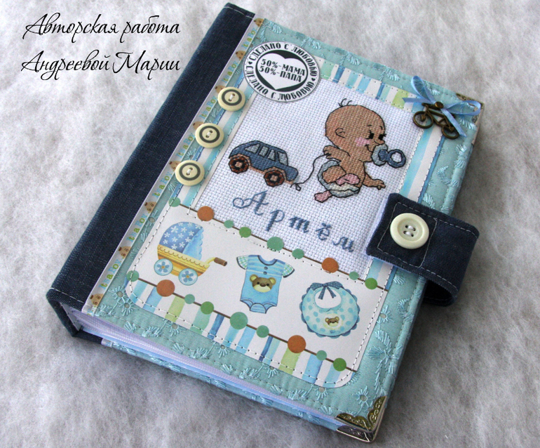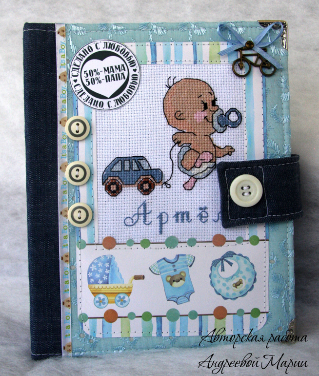 Вышивка крестомФотоальбом для мальчика Артема. Формат 19 на 22 см. 200 фото. Белые файлы. Обложка - хлопок+голубой джинс. Кармашки под бирку, локон и зубик.