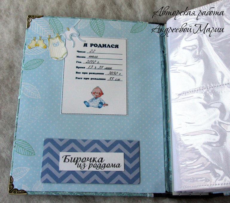 Фотоальбом для мальчика Артема. Формат 19 на 22 см. 200 фото. Белые файлы. Обложка - хлопок+голубой джинс. Кармашки под бирку, локон и зубик.