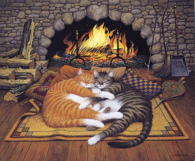 из США, где жил и творил замечательный художник Чарльз Высоцкий...и рисовал он котиков. Первый раз его картину, вернее конечно копию его картины, я увидела в салоне маникюра.. это были коты "All burned out" (Все сожжено!- дословно) Но пока писала пост одна моя знакомая живущая в штатах прислала перевод)) All burned out в грубом переводе означает что-то вроде Совсем ухайдокались (если точно, то переутомились, перегорели, т.е. набегались-наигрались до изнеможения). И то, что лежат у огня, создаёт игру слов. И вот теперь все встало на свои места, мой пазл сложился ибо я никак не могла понять связь названия и картинки!)))