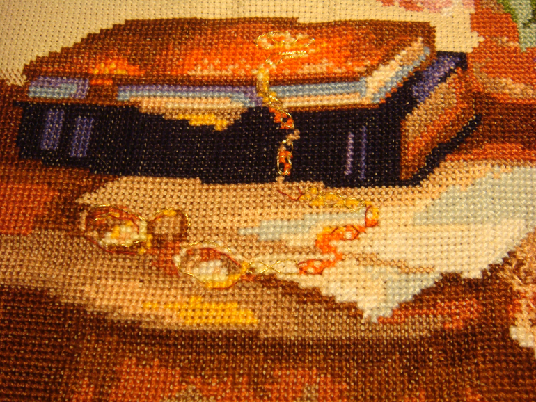 Начала я его летом 2012 года, сделала десяток крестиков и отложила.Сейчас я поняла,что меня отпугнули крестики в 3 нити. Тогда даже придумала для кого и на какой праздник его подарю.но вот юбилей этого человека прошел, а я даже не начала. в январе я решила опять вернуться к нему. и вот так неожиданно закончила