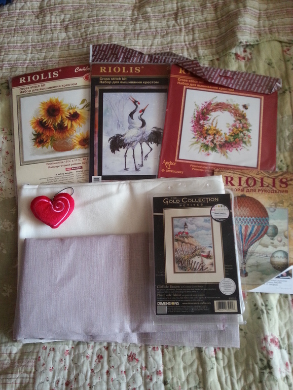 Шикарные наборчики! Я на журавлей давно засматриваюсь)) хочется попробовать на канве с напечатанным фоном. А что за отрезы лежат?