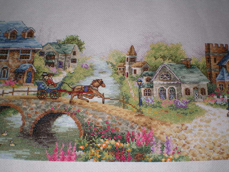 Люда, очуметь можно от такой красоты и такого размера!!! Я бы такую деревеньку лет пять вышивала!!! Ты молодец!!! Красиво, множество деталей любопытно рассматривать!!! Теперь в багетке упадут от размера работы!!!
