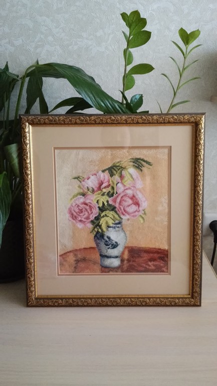 11. Пионы от Панны, моя первая работа. Оформляла в багетке, пока вместо них висит цветочная улица, а пионы стоят в шкафу, не знаю пока куда их повесить