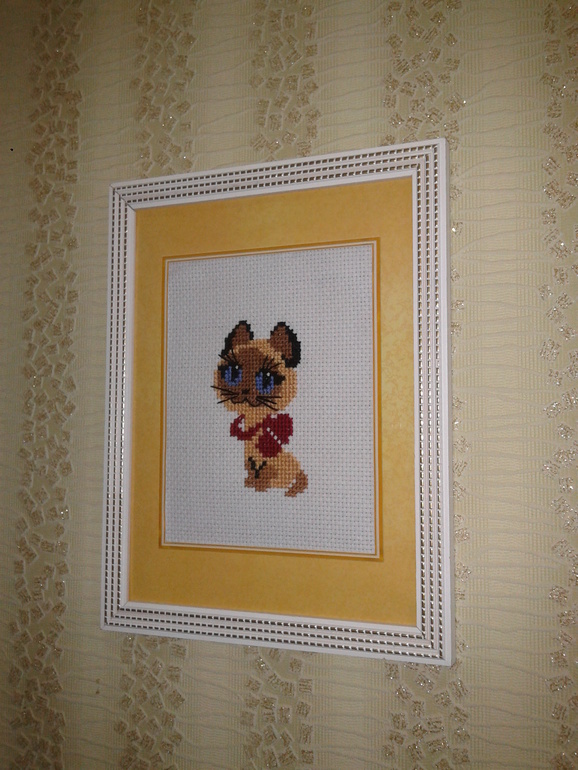 2. котенек Гав, схема из тырнета, рамка покупная, я картинку вырезала из центра, получилось паспарту :) она у меня висела на работе, и я говорила,что это мой автопортрет :)