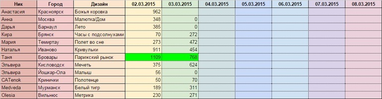 Напоминалка: сперва складываем проценты за канву и за цвет, а потом количество вышитых за день крестиков умножаем на эти проценты