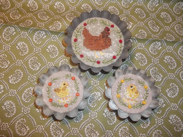 (т.е., я) вышила замечательную троицу, на которую давно облизывалась. Это курочка и два цыплёнка. К сожалению, пока не удалось полностью собрать работы и потому фотографирую не на ёлке. Но итог вполне очевиден))
