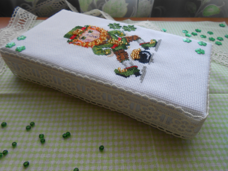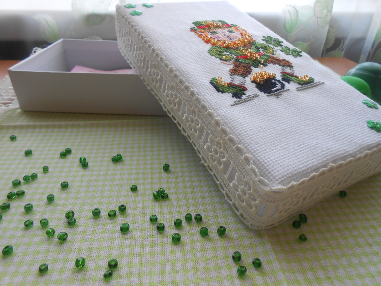 да что там мастерить)) готовая коробочка, приклеила вышивку на 2-хсторонний скотч, пришила кружево и всё))))