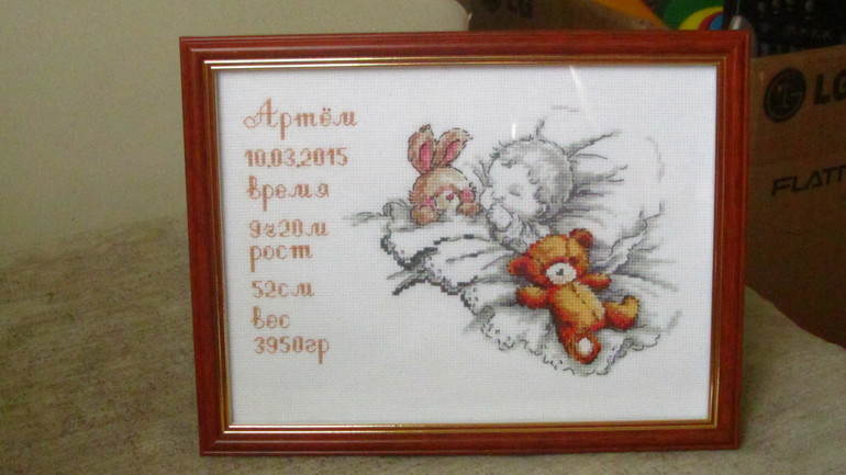 Вышивка крестомВышивалась метрика легко и быстро.Нитки гамма ,канва 16 аида.Оформляла сама.Прошу под срез за фото