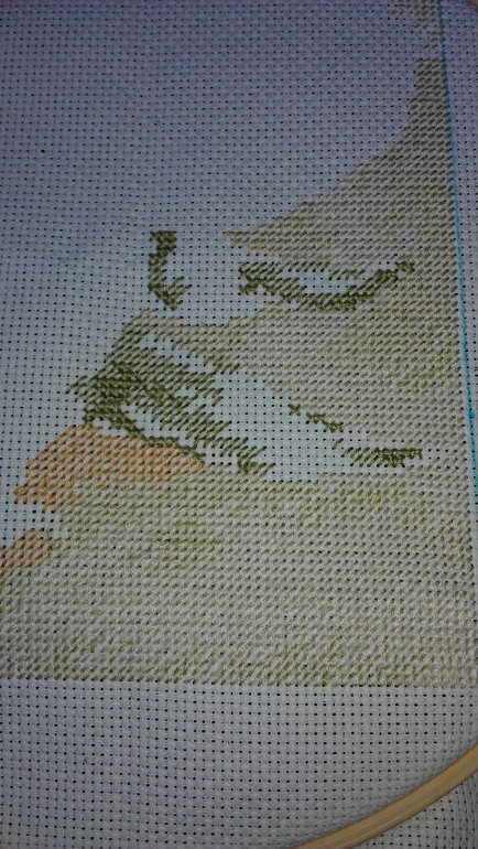 посмотрела в инете описание, там используется канва гамма 14 белая, посчитайте крестики, вам внизу советовали, оставьте как есть.Полукрест так и должен просвечивать, за счет этого создается эффект акварели и легкости