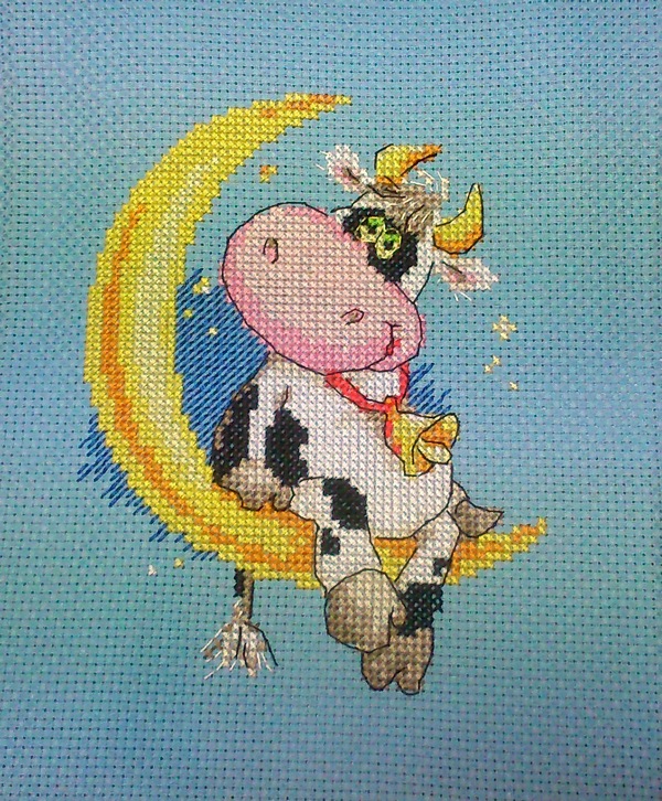 Вышивка крестом"Корова летела по небу, а вокруг неё вились, как золотые пчёлки, звёзды. Но вот скоро её ослепил холодный лунный свет. Она зажмурилась и прыгнула...."