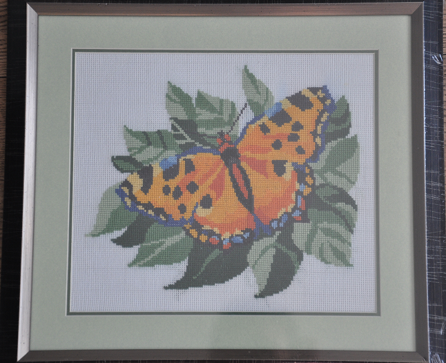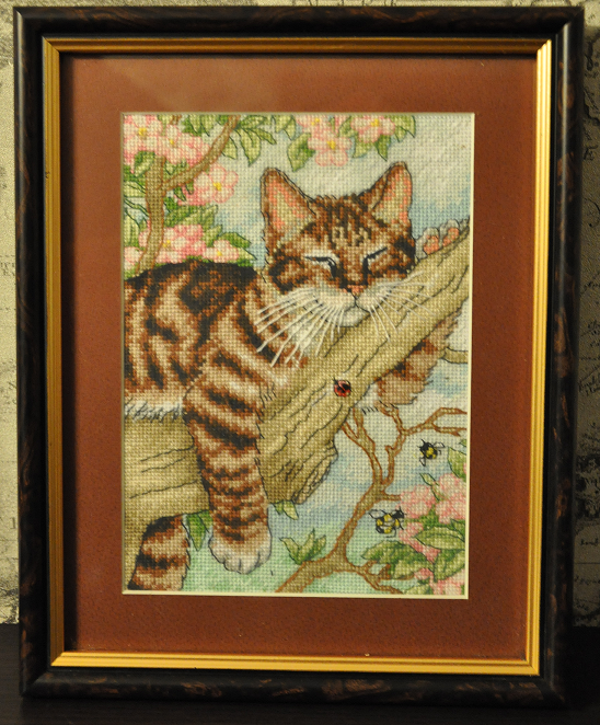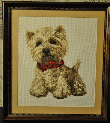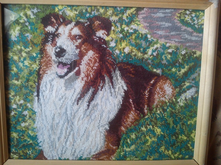Эту собачку я вышивала еще 10 лет назад, учась в школе. Это моя первая большая работа. Схема была взята из какого-то журнала. Нитки подбирали вместе с мамой. Если мне память не изменяет, то вышивала в 6 (О Боже) ниток.