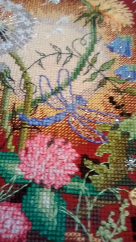 Пока вышивала, так и представляла то горы, то поля))) А сколько интересных нюансов: прозрачные, переливающиеся крылышки стрекозы, пушистые одуваны, нежные колокольчики и т.д., и т.д...