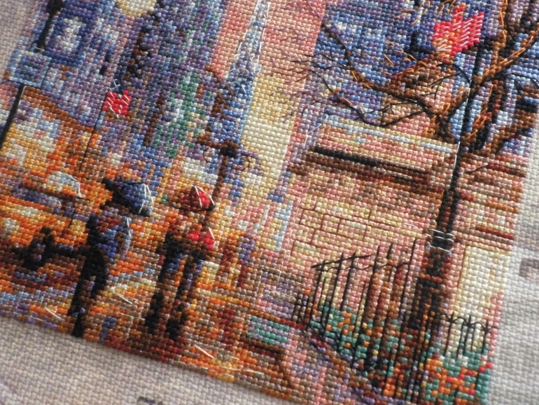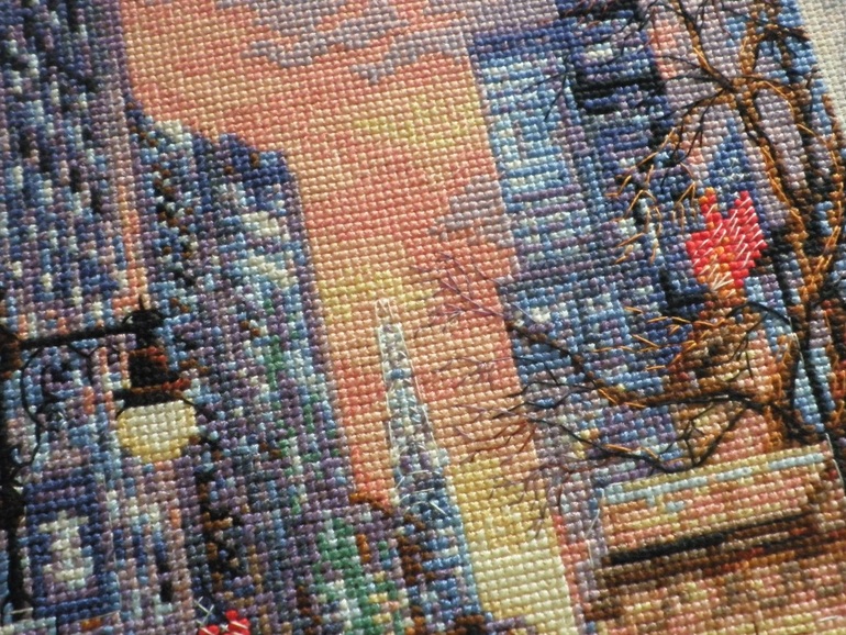 Небо вышилось на одном дыхании, а вот низ "порадовал" совершенно невразумительной мешаниной из одиночек... Хотя,надо признать, очень красивой,насыщенной по цветам, мешаниной)))) И буквально несколько стежков бэка по готовой вышивке превратили её в прохожих,кэб,трамвайчик....