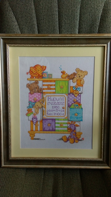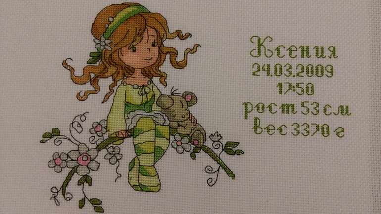 Третью метрику вышила в подарок - крестнице мужа. Настолько эта девчушка мне понравилась, я загорелась и вот она готова!