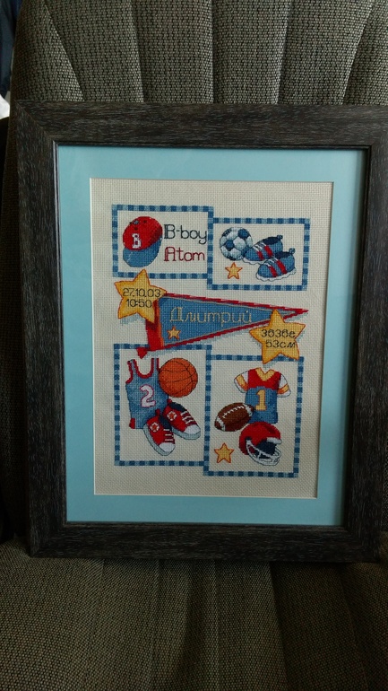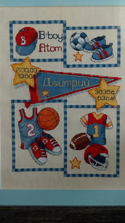 Вышилось за 2 недели + неделю занималась бэком. Вторую метрику вышила старшему сыну, ему 11 лет, вот так вот запоздало... Очень хотелось найти что-то не очень детское и вот я нашла Дим "Маленький спортсмен". Хотелось немного изменить, подстроить вышивку под моего сына, но не все получилось. Хотела шлем и мяч для игры в американский футбол поменять на перчатки и шлем для бокса (сын занимался боксом), но у меня ничего не получилось, поменяла только надпись - это его ник на брейке.