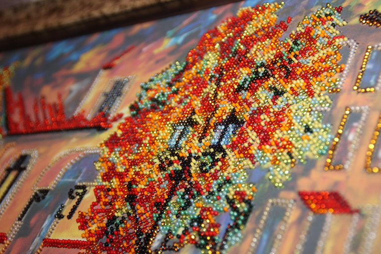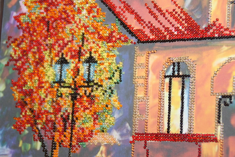 Купила несколько лет назад набор для вышивания бисером "Краски октября" от Абрис-Арт. Но рамы для вышивания или станка не было, а на не натянутом холсте шить не получилось, поэтому отложила вышивку на несколько лет. Станок появился, и за месяц я все вышила!!! Начинала шить мононитью, но она так путается((((( Терпения на мононить не хватило, шила обычными нитками.