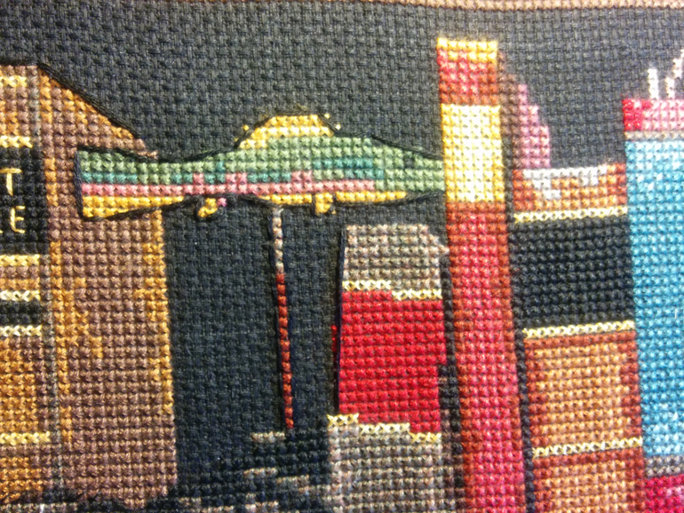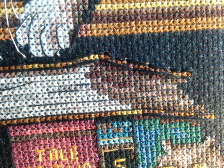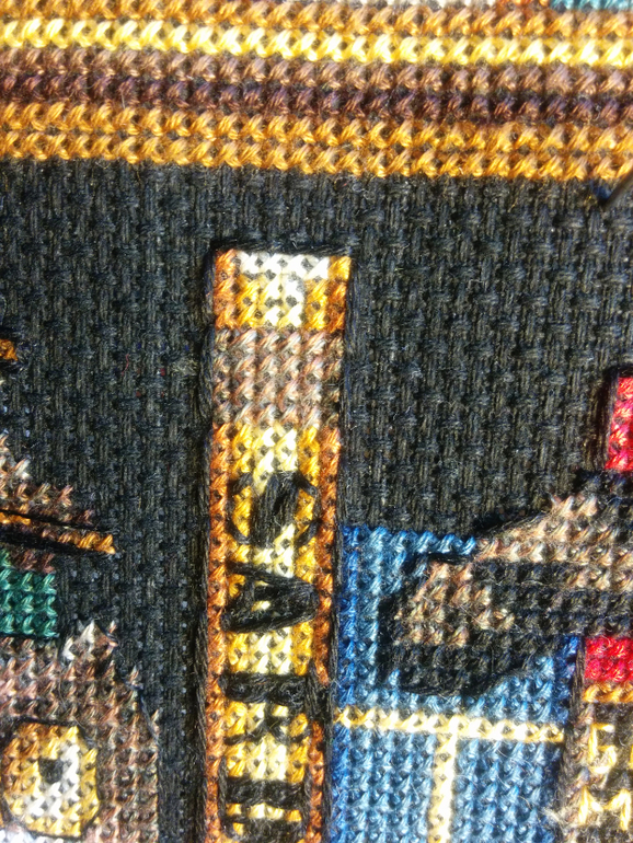 По одной они проваливаются между крестиками и не видно совсем ниточку. Когда сову или лапки делала,то она не по рядам идет, а по верху крестиков и её видно.Но стоит ниточке пойти по прямой и она проваливалась, а тем более все темное, что усугубляет маскировку:):)
