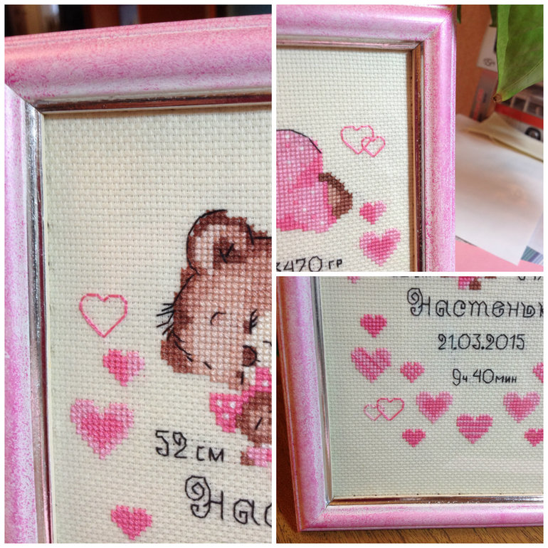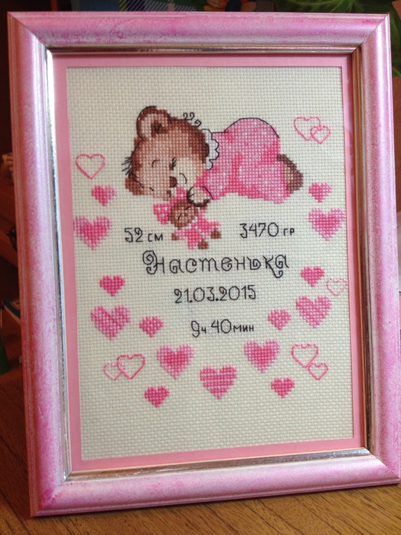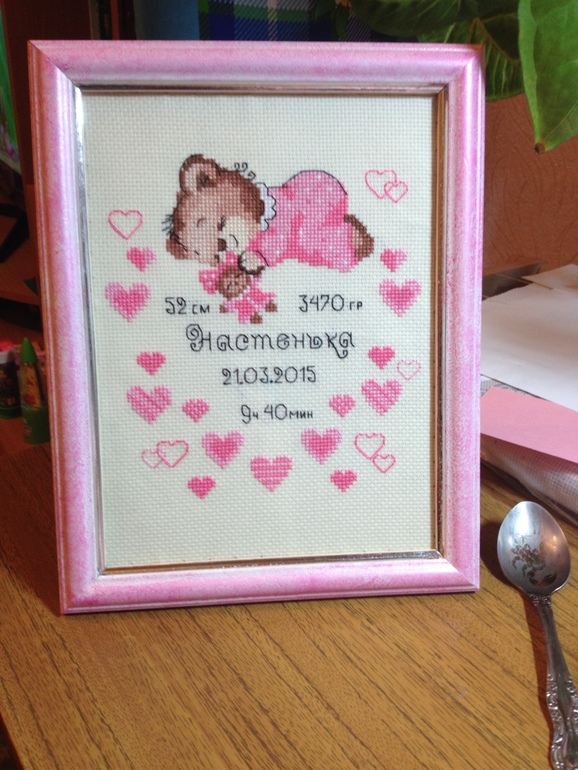 Есть вопрос!Девочки,помогите,пожалуйста,советом!! Я вышила для подруги метрику,оформить решила сама,т.к. завтра уже дарить. Но..не угадала немного и вот что вышло