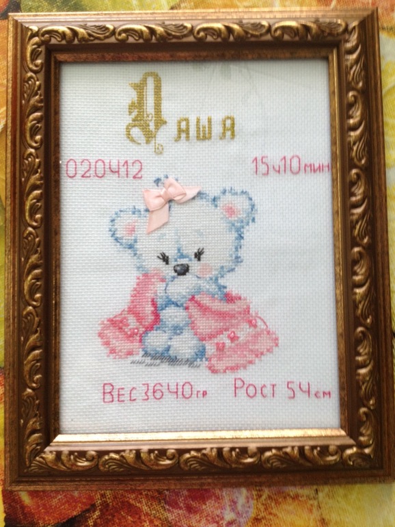 Вышивка хорошая,а вот надпись на мой взгляд не очень,я бы в одном стиле сделала,в дате рождения точки бы поставила или отступила,граммы вроде просто г сокращенно или я путаю?)(Ну главное,что подарок одаряемому понравился)