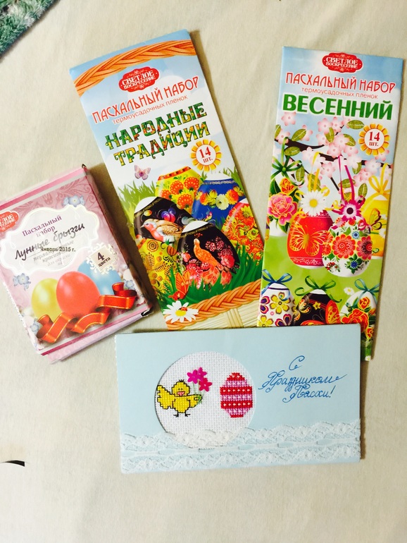 Это посылка номер2! Наклейки и краска для яиц и просто очаровательная самодельная открытка с вышивкой!!!! Она просто бесценна! Такая милая с душевным посланием! Настя, ты прислала в нашу семью море положительных эмоций и радости! Еще раз спасибо огромное!