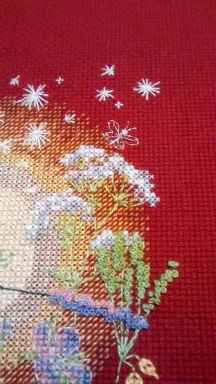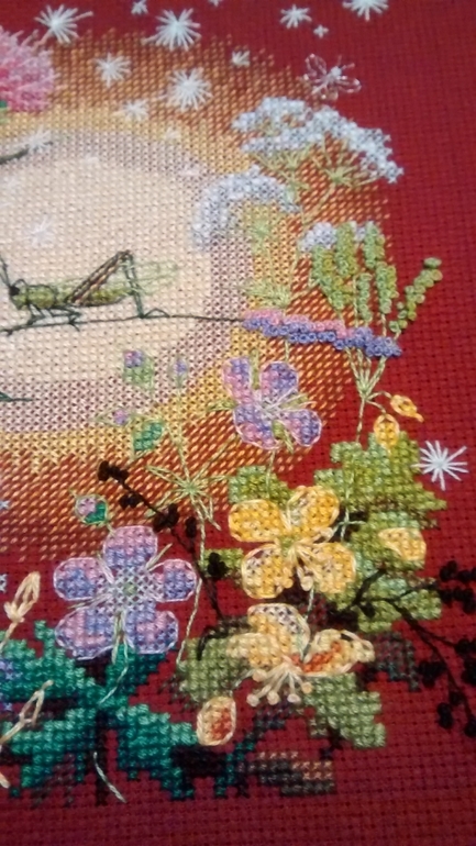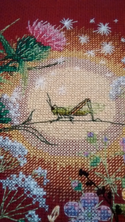 Впечатление - эта картинка послабее, чем первая, хотя деталей тоже не мало. Очень понравились чертополох, кухнечик, "кашка" (не знаю, как называется эта трава, а мы ее называли кашкой)))))) и даже клопик,. которого мы называли "солдатиком" (вчера на улице специально рассматривала, точно не божья коровка)))))). Ну и сами детали...