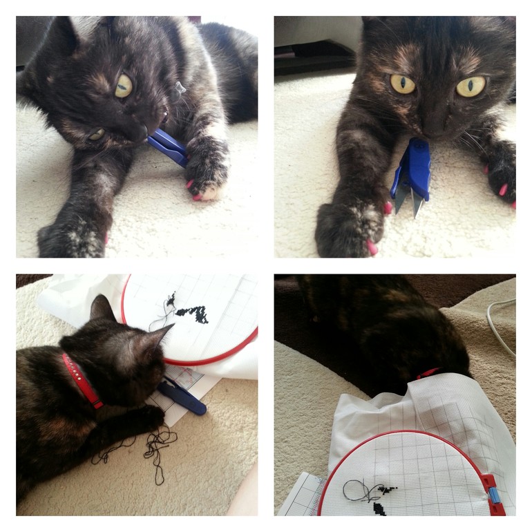 У меня их двое, но вот прямо вышивать любит одна только. Она постоянно и пакет с вышивкой на прочность проверяет, и состояние работы наизнанке и вообще все крестики считает пересчитывает)) А старшая кошка просто любит рядом ноги греть))