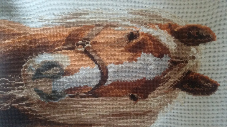 Выношу на ваш суд мою законченную лошадку. Картина, если не ошибаюсь, фирмы Алиса, называется Адель. Давнона нее заглядывалась-уж очень добрая дошадка, от нее идет какой то позитив. Схемку скачала с интернета, ниточки гамма, канва белорусского производства была куплена давно и лежала в запасах. Два с половиной месяца ушло на эту работу. Вышивалось легко, вот только ждал меня небольшой неприятный сюрприз-один цвет в ключе не совппадал;перерыв интернет, я нашла информацию об этой ошибке. Конечно пришлось переделывать, но хоть радовало то, что ошибка была только в одном цвете ниток, остальной подбор был правильным. Оформлять буду сама, хочу попробовать поучиться с паспарту