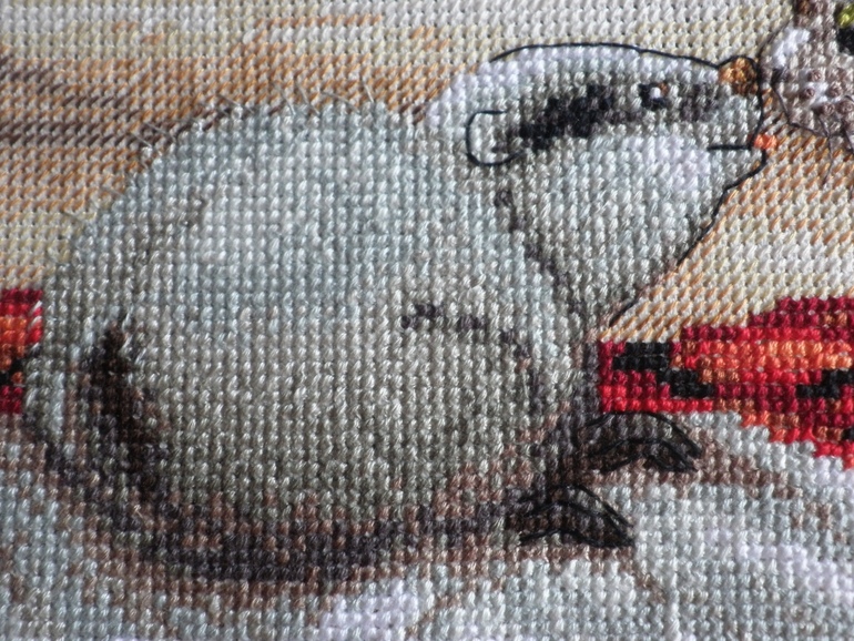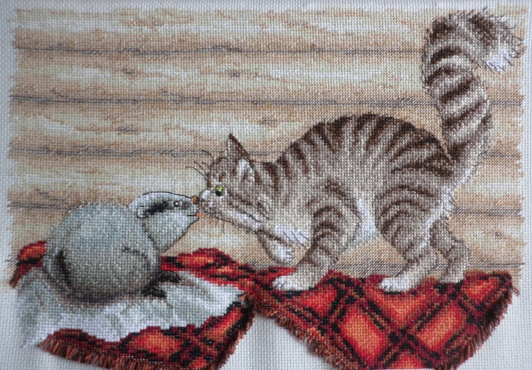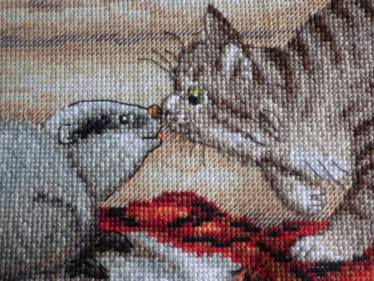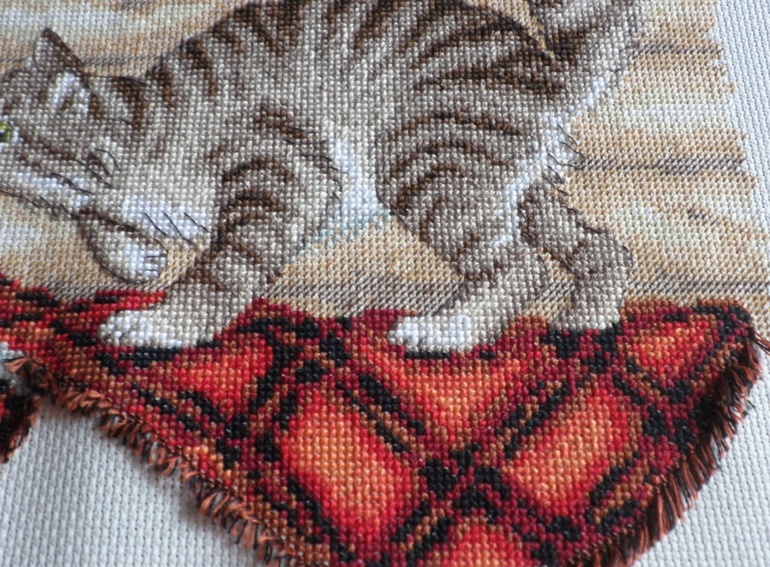 В состав набора входит канва Аида16,размер 20*30 см, 24 оттенка мулине. Фон вышивается полукрестом в 1 нить,сам сюжет крестом в 2 нити. +бэк,несколько фрузелков и бахрома на пледике)