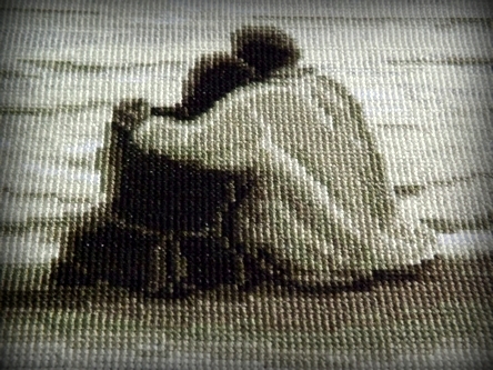 А мне ведь всего лишь нужно было сделать фото в нужном ракурсе. И чтобы это было ну прям вооооще романтично! Я помнила об этом моем желании весь южный отпуск. Немыслимым образом соорудила тортик чуть ли не на костре, навела марафет, попыталась оставить детей в их комнатах и на весь вечер улететь с мужем на метлах, но БАЦ - и дети никак не захотели отпускать нас летать одних. Ладно, проехали, пришлось брать семейную ступу. Спустились к берегу почти отвесно, на задницах. Было весело. И тут вам второй БАЦ! Ветер поднялся не пойми откуда и пошел дождик. Все мои идеи со свечами канули в...море. Реально канули, вместе с полотенцем и пакетом. Опять проехали. Сели на мокрое, ибо на камнях заднице было неуютно. И вместо того, чтобы сосредоточиться на фото (я только теперь подумала, - а кто бы нас фотал, если я собиралась без детей лететь?))), мне пришлось битый час вытягивать моего Митьку из воды, потому как было безумно холодно, а он уже весь мокрый был. Алька моя изнервничалась с фотоаппаратом, но наклацала кое-как нас, беснующихся. Потом укутались все в парусину от старой лодки и сидели так, пока не стемнело. Дома, разбирая фотографии, я хохотала взашей, хоть и нет такого выражения, но по-другому и не скажешь. Предательски вылезли лямки лифчика на спине, сколько я их не прятала под мой совсем не учительский вырез на спине, ветер решил, что его стиль мне больше подходит. А самое стремное, что мы сели в этой кутерьме наоборот! В дизайне Вервако, под который я хотела сделать это фото, девушка сидит справа. Но ПМ - программный бог! Раз-два - и усе в порядке, шеф! Еще пришлось отрезать кусочки неба, переворачивать и добавлять сверху, чтобы повторить пропорции фото, но это мелочи. Потом я ушла в омут вышивальной жизни и работу эту забросила, ибо непостоянна в достижении результата, к сожалению, или к счастью, кто ж его знает. И вот теперь,не прошло и трех лет, я это сделала вместе с девочками из ВД! Когда-нибудь даже оформлю примерно так, как на верхнем фото. И еще пару кадров поближе напоследок: