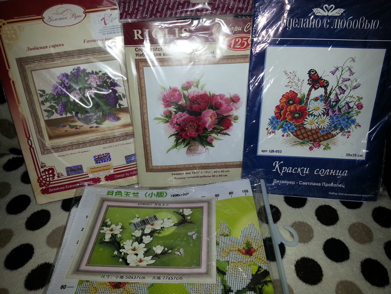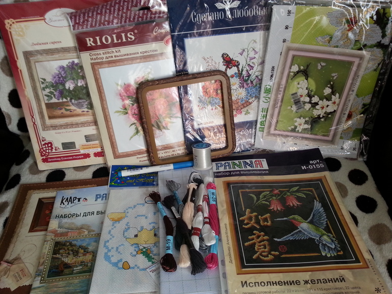 Поздравляю, чудесный подарок! Столько наборов, каталоги, пяльцы, канва — глаза разбегаются. Конфетка очень вкусная! :)