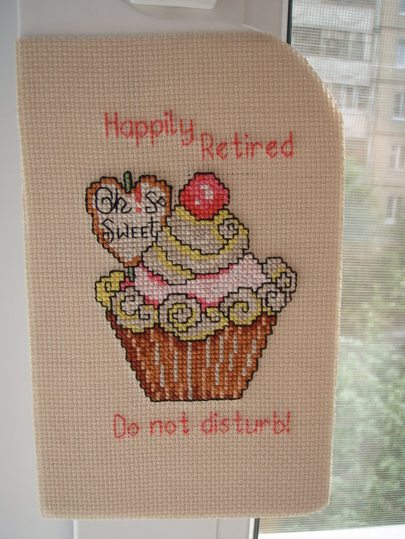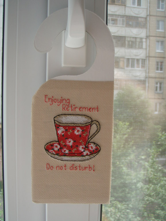 Вышивка крестомПоскольку оба моих родителя теперь пополнили славное общество пенсионеров (формально... так-то оба работают и ведут весьма активную социальную жизнь), то я соорудила вот такую табличку на дверь (двусторонняя):