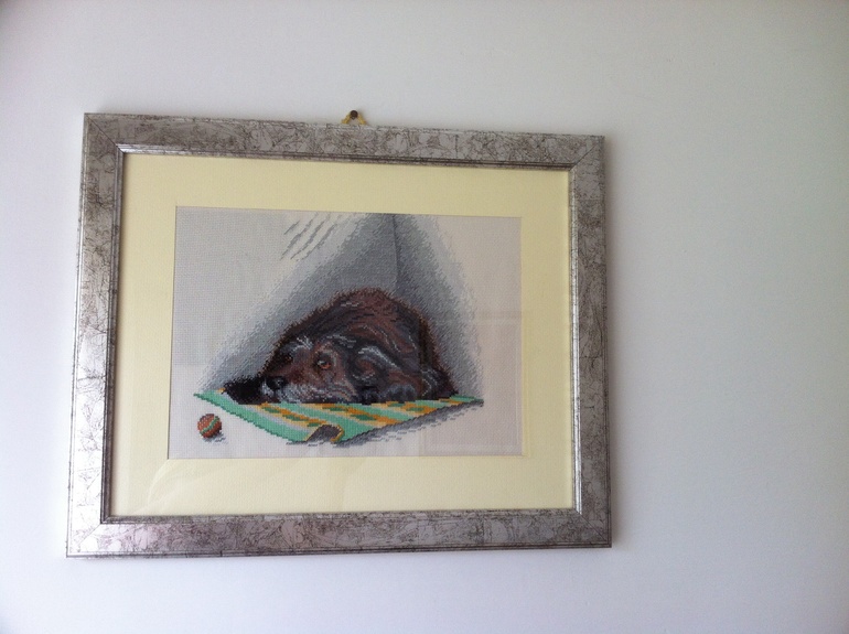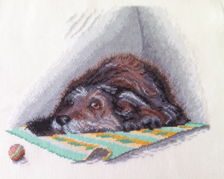 Что касается выбора сюжета, эта картина является точной копии собаки Лайки сестры моего мужа. Ну просто один в один. Есть даже предположение, что автор рисунка видел мое фото этой собаки в сети.