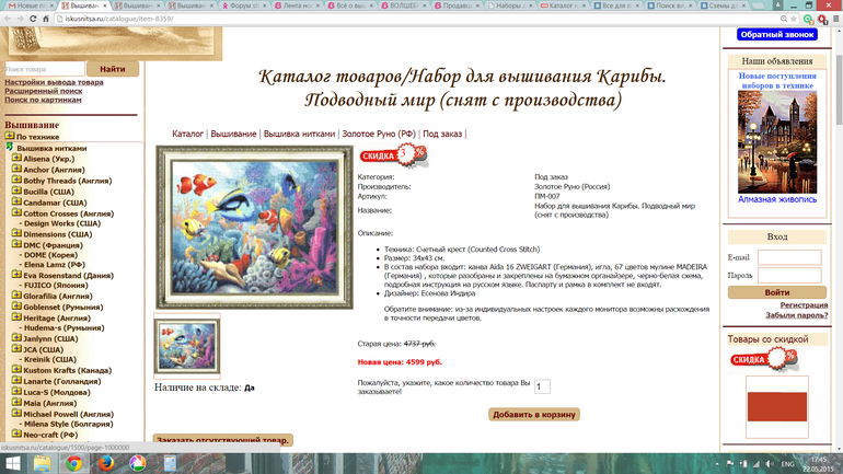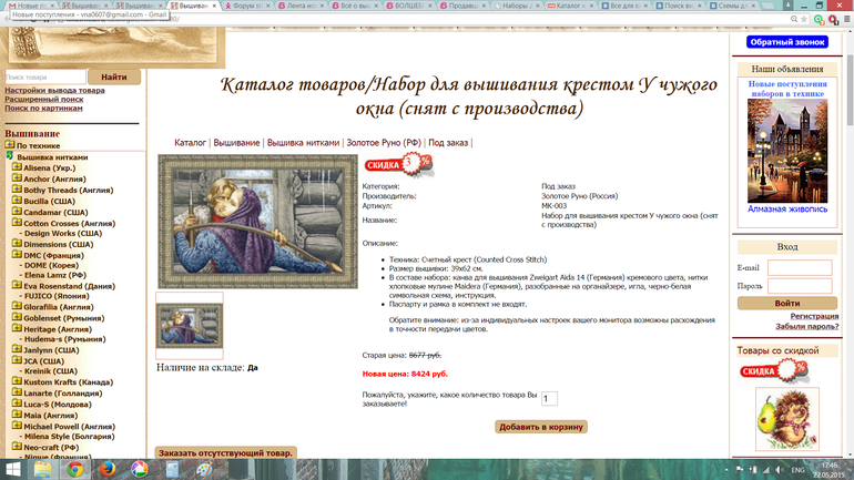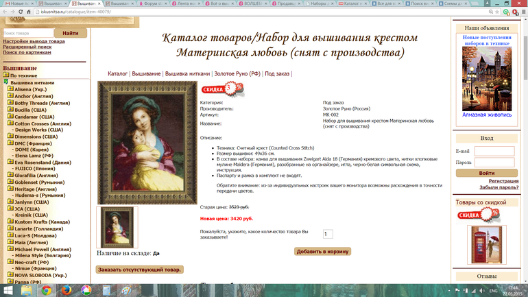 Если плохо видно, я переведу: за Карибы они хотят 4599 рублей, за Материнскую любовь (которую я меньше года назад брала в фирменном салоне за 500 с копейками) - 3420 руб., а за чужое окно и вовсе какие-то смешные 8424 руб... Вот даже не знаю, кто больший молодец, ЗР, которые сначала снимают последние более-менее приличные наборы (ибо на их новые "творения" без слез смотреть вообще нельзя), а потом за отдельные деньги на заказ их собирают (надо сказать, деньги приличные, но все же раза в полтора дешевле, чем вы видите на картинках), или Искусница, которая пытается воспользоваться волшебной фразой "снят с производства" и втюхать несведущим давние хочушки по просто нереальной цене... Это всего лишь Золотое руно - все те же Цвайгарт, Мадейра (которых еще может и не хватить) и черно-белая схема - всё! За что эти люди хотят такие деньги? Чего-то я не понимаю в этой жизни...