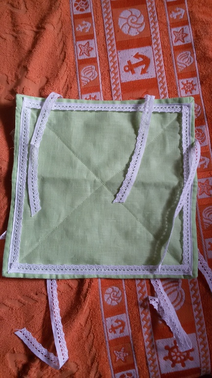 . И даже успела привязать ее к табуретке. Благо, никто не успел на нее попу пристроить. А оказалось, что эти ленточки надо связать, подняв уголки вверх. И получится сухарница. Такая суперская идея!!!