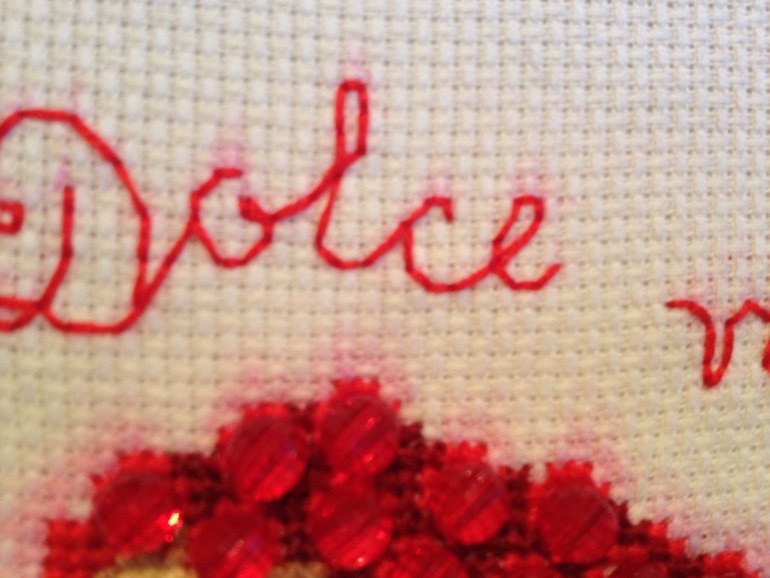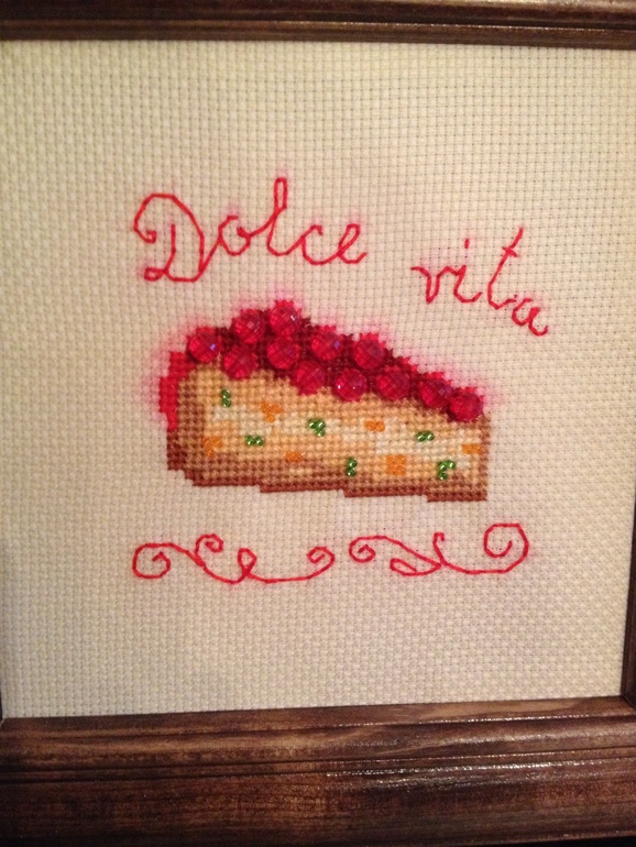 Подружке завтра вручать подарок, начала оформлять.. Дотянула, так вышло( даде не стирала, только намочила, были заломы на канве, ну и все пролиняло( нет, ге все- только красное! Так что будьте осторожны, у кого тоже такие есть пироженки..хотела всю серию, теперь подумаю((((